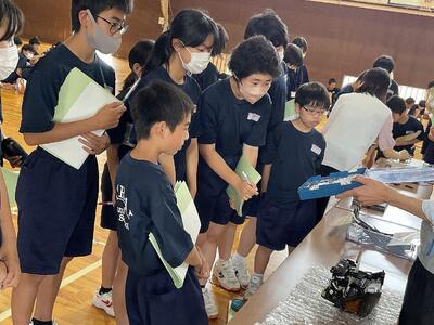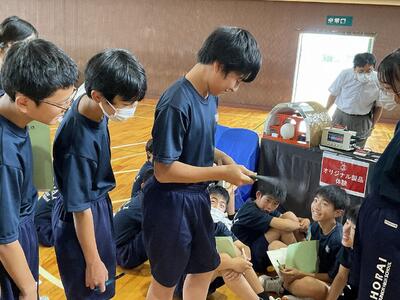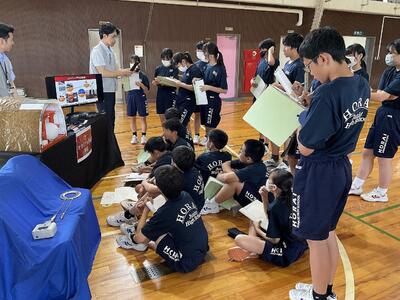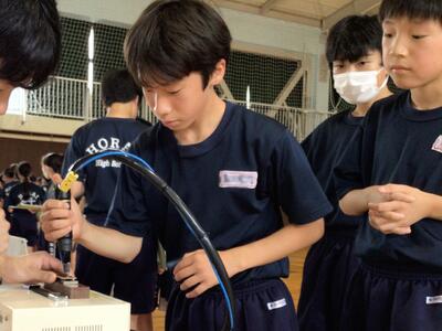 仕事内容の紹介、クイズ、3つの体験活動、そして仕事の目的についてお話をいただきました。特に体験活動ではグループに分かれ発電装置や溶着など、貴重な体験をさせていただくことができ、生徒たちも楽しそうに取り組んでいました。