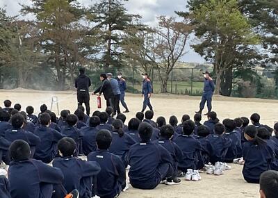 今回は、震度5強の地震が発生した後、調理室から出火したことを想定した訓練が行われました。また、消火器の構造や使用法の確認も行われました。どの学年も落ち着いて速やかに避難することができ、消防署の方からお褒めの言葉をいただきました。