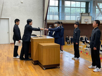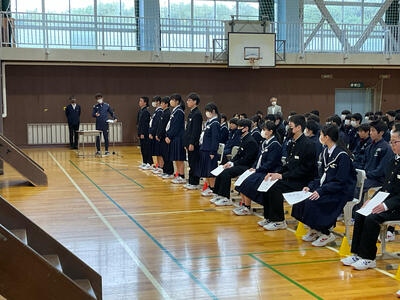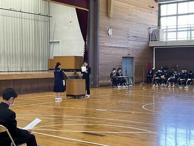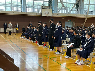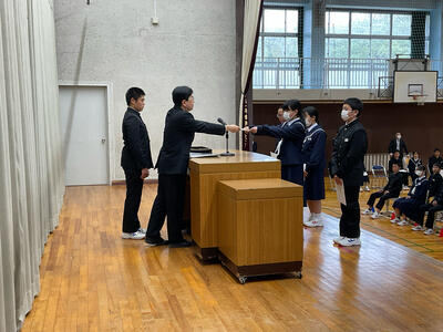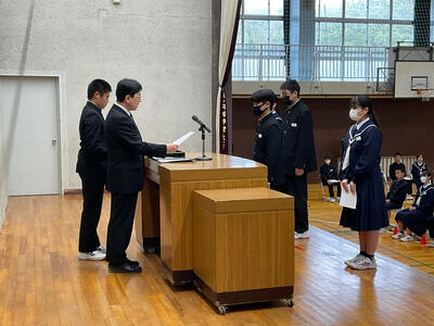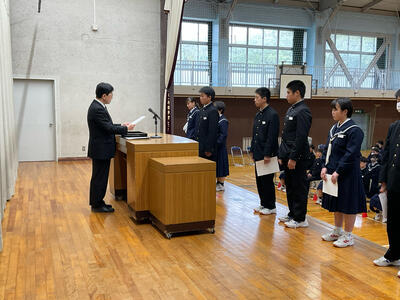 今回の全校集会では、生徒会本部役員、学級委員、専門委員長の任命が行われ、校長先生より任命状をいただきました。学校や学級を代表するみなさんの返事は素晴らしく、これからの活動へのやる気を感じました。また、任命された皆さんだけでなく、全校生徒で充実した学校生活になるよう積極的に活動してほしいと思います。