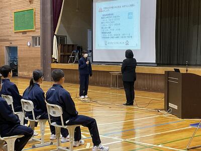 個人情報の漏えいやSNSのトラブル、ネット・ゲーム依存などの問題から自分の身を守るためにはどうしたら良いか、事例をもとに具体的にお話しいただき、生徒たちも集中して話を聞いていました。