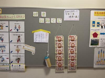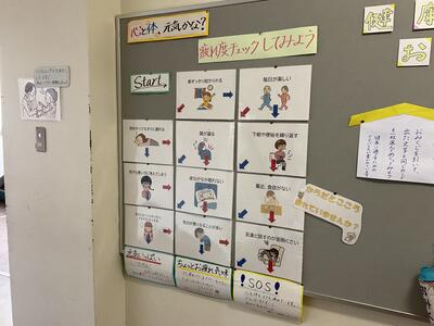 保健室横には、保健室からの健康に関する工夫を凝らした掲示物が貼られています。定期的に張り替えられ、変わる度に、お昼休みに生徒が立ち止まって、興味津々に見ているのをよく見かけます。