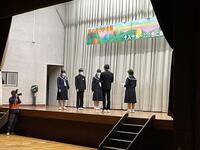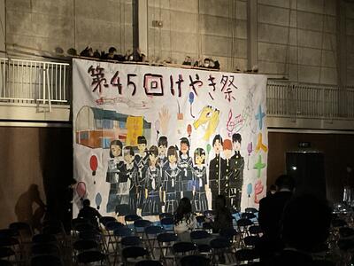 開会式では生徒会長を探せ!が印象的でした。また、今年のテーマ・サブテーマ「十人十色~220色に輝け~」の考案者2人と全校制作係への表彰や、看板作成を行った美術部の発表もありました。