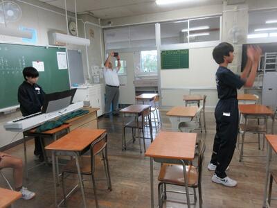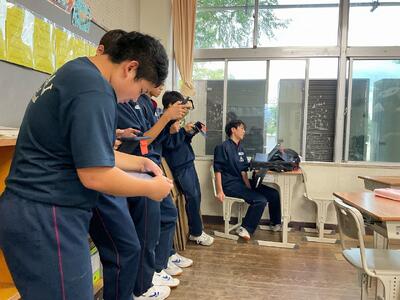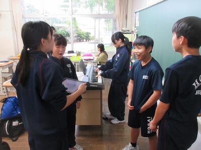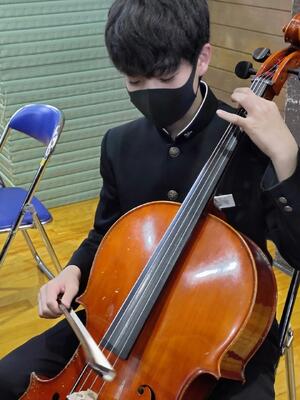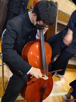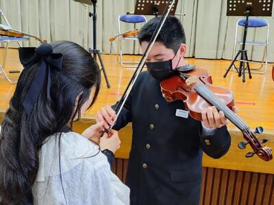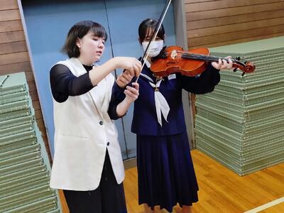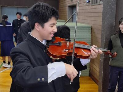 2024年10月30日 13時25分先日行われた芸術鑑賞教室での楽器体験の様子です。楽器体験をした生徒は、はじめて弦楽器に触れる人がほとんどでしたが、音が鳴ると「楽しい!」という声が聞こえてきました。