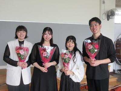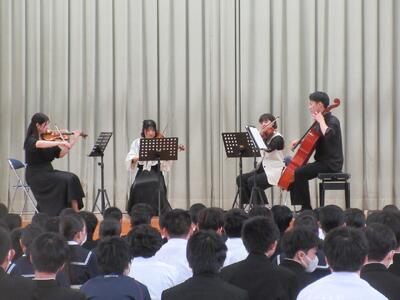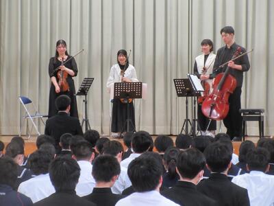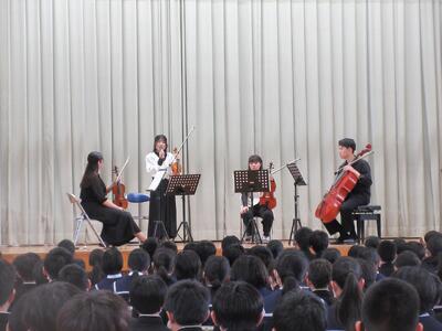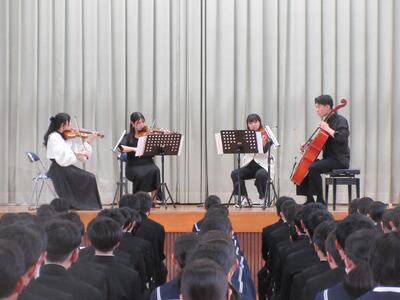 23日(水)の午後、芸術鑑賞教室として、福島青年管弦楽団から4名の方にご来校いただき、弦楽四重奏を演奏していただきました。