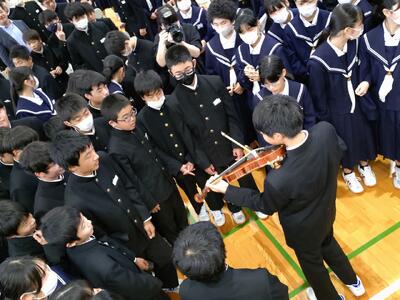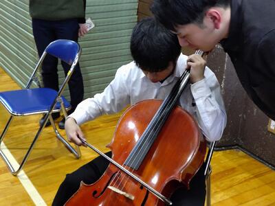 先日行われた芸術鑑賞教室での楽器体験の様子です。楽器体験をした生徒は、はじめて弦楽器に触れる人がほとんどでしたが、音が鳴ると「楽しい!」という声が聞こえてきました。