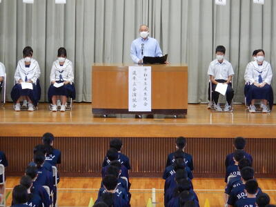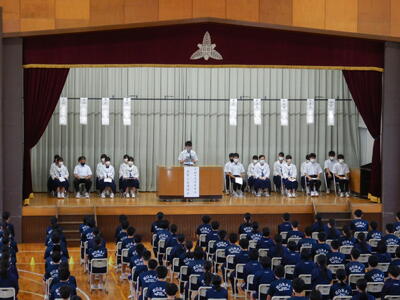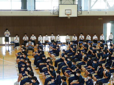 立会演説会では、まず、選挙管理委員長が「全校生の真剣な思いが、この蓬莱中をつくっていきます」とあいさつをしました。(写真C)