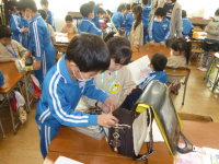 4校時は1年生にランドセルや教科書などの学用品を見せてもらったり、一人一人に手作りのメダルをもらったりしました。