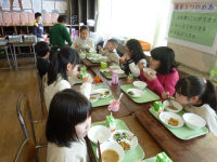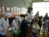 給食は、5年生に準備を手伝ってもらいながら仲よく一緒に食べました。