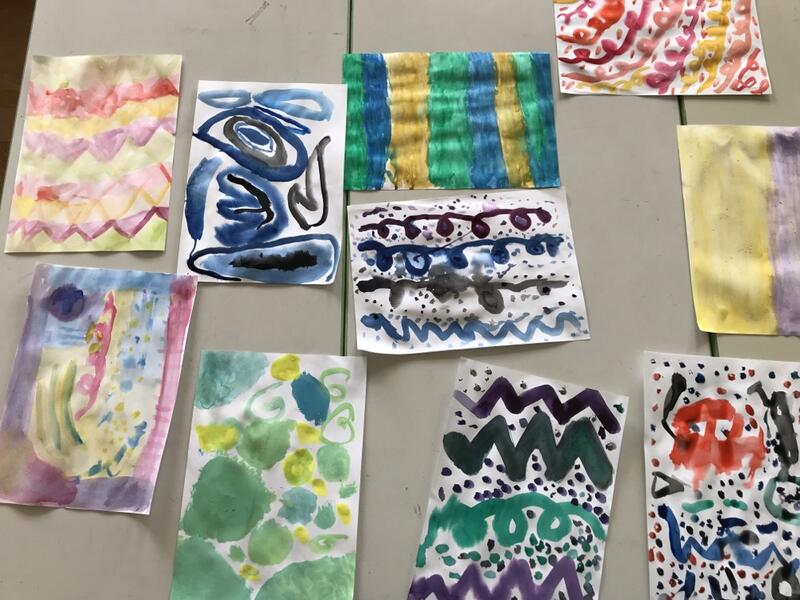 1組は、今後学習する「ふしぎな たまご(絵)」で利用するために、絵の具遊びをして素材となる模様付きの作品を作っていました。