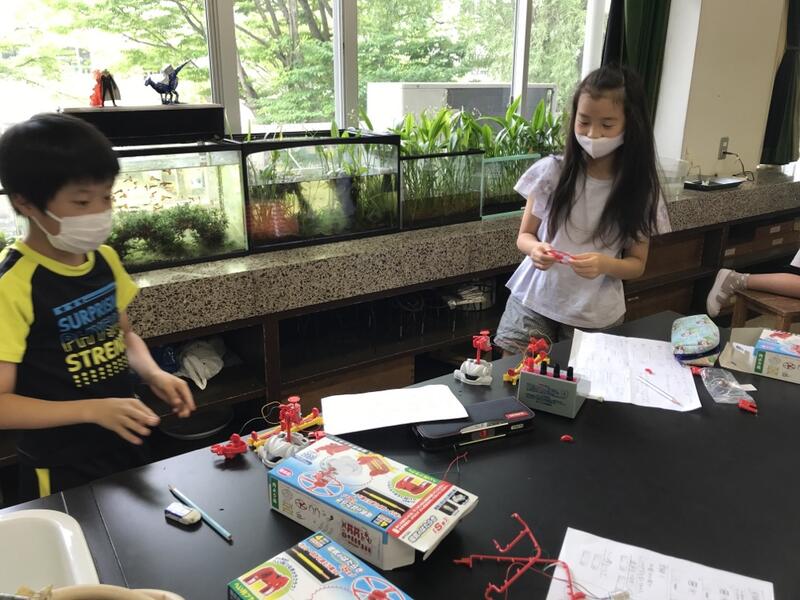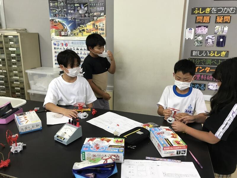 「直列つなぎ」と「並列つなぎ」の2種類を実際に試してみて、学習したとおり直列つなぎの方が、プロペラが勢いよく回るのかどうか確かめていました。