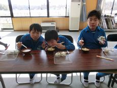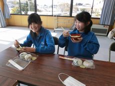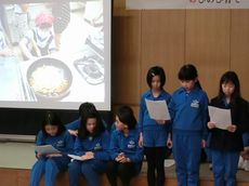 閉校式の後は、子どもたちも楽しみにしていた感謝の集いです。写真をスライドショーで映しながら、1年間の活動のまとめを発表した後、自分たちで作ったおにぎりと味噌汁を全員で味わいました。前日から準備を進め、火加減に気をつけながらご飯を炊いたり、野菜を切ったりし、作ってくれたおにぎりと味噌汁はとってもおいしく、思わず食べ過ぎてしまうほどでした。