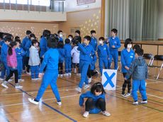 ふれあい班で行ったゲームは、6年生にちなんだ問題の「まるばつクイズ」と「新聞島ゲーム」の2つです。1~6年生までが協力してクイズの答えを考えたり、新聞からはみ出ないように体を支えあったりし、楽しい時間を過ごすことができました。中には、下級生をおんぶする6年生の姿も見られ、ほのぼのとした光景が広がりました。