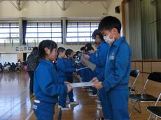 その後は、プレゼント贈呈です。班ごとに撮影した写真と1~5年生のメッセージを貼った色紙を1年生が6年生に手渡しました。すぐに袋から色紙を出して目を通した6年生は、ちょっぴり照れくさそうな表情を見せていました。