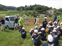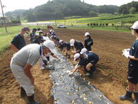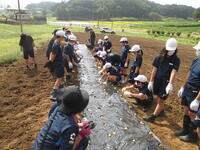 ジャンボニンニク(エレファントガーリック)植え 2022年9月27日 11時50分 本日、UFOエレファントガーリックとなかまたちの方を講師に、5年生が種植えをしてきました。学校近くの畑を借り、作ってくださった畝にマルチかけを手伝いました。そこに、一人5個種を植えました。今回植えたのを収穫するのは、令和5年の6月です。それまで手入れをしながら大きくなるのを楽しみにしています。今年度は、学校でバケツ稲ならぬ、鉢植えニンニクを育て、成長の様子をしっかりと記録に残していきたいと思います。