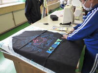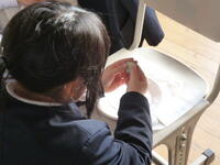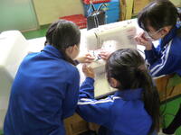 ミシンの使い方に慣れてきた5年生。いよいよ自分だけのエプロンを作ります。布を裁つ作業も慎重です。上手に仕上がると良いですね。