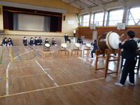 太鼓クラブ入部希望者が、練習の様子を見学していました。目がキラキラと輝いています。お祭りや学習発表会で演奏する姿を想像しているのかもしれません。