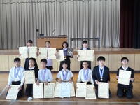 陸上競技大会の表彰を行いました。今年度は、Aブロック準優勝に輝きました。練習を一生懸命頑張ってきた子供たちは、賞状やメダルを手にし、とてもうれしそうでした。