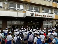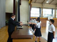 7月に行われた水泳大会の表彰式を実施しました。オンラインで全校生が教室で見守る中、選手たちは体育館のステージ上での表彰です。