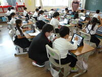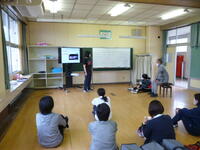 1年生が、オンライン接続のチャレンジです。ICT支援員の先生に教えてもらいながら、接続の手順について確かめました。画面に友達の顔が映っただけで、大歓声があがるほど大喜びでした。これからもどんどん経験して、慣れていきましょう。