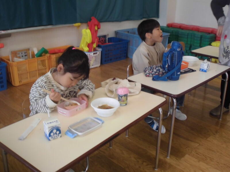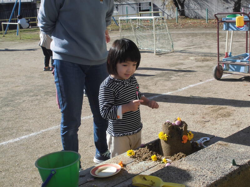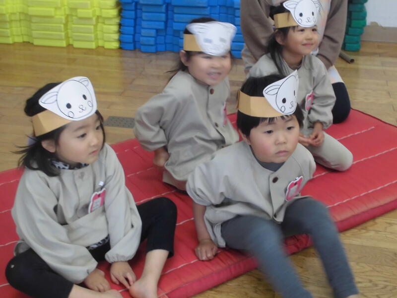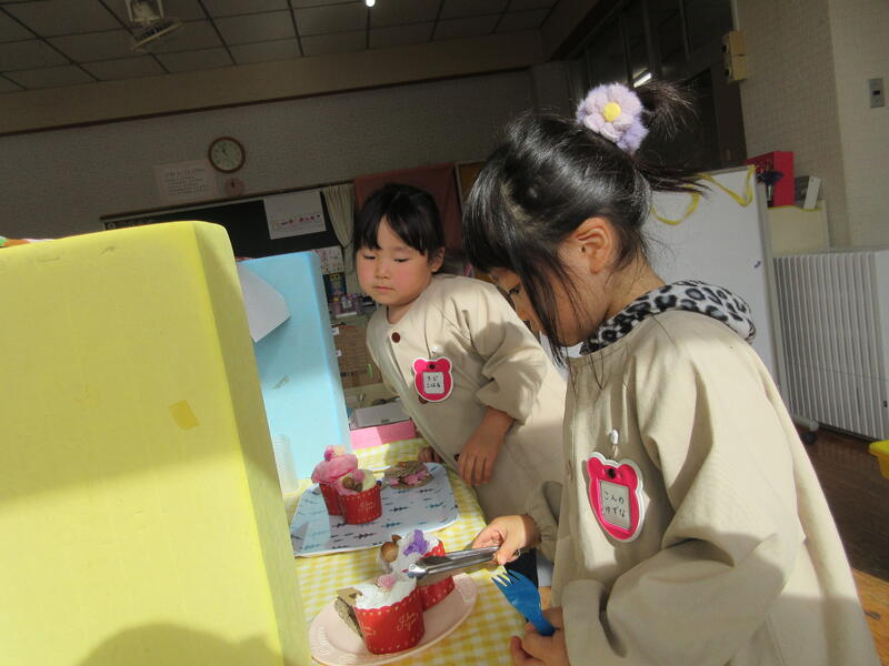 年少さんは、お店屋さんごっこをしました。お客さんにおいしそうなケーキやビスケットを勧めて、お皿に盛りつけてごちそうしてくれました。また、遊戯室でヒツジの子どもたちになって狼から逃げる「引っ越しおに」を楽しみました。
