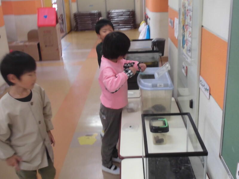年長さんは、幼稚園生活の約束事を確認した後、幼稚園で飼っている生き物にエサをあげていました。