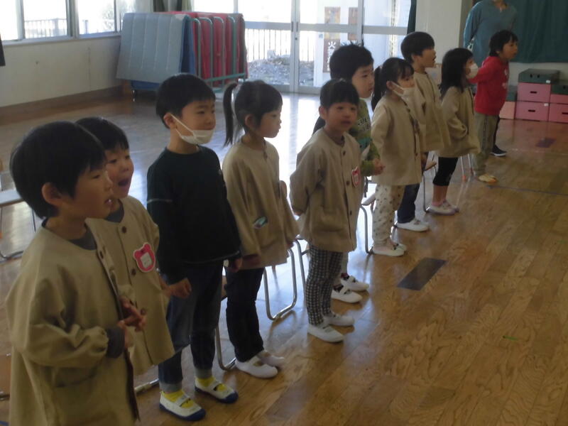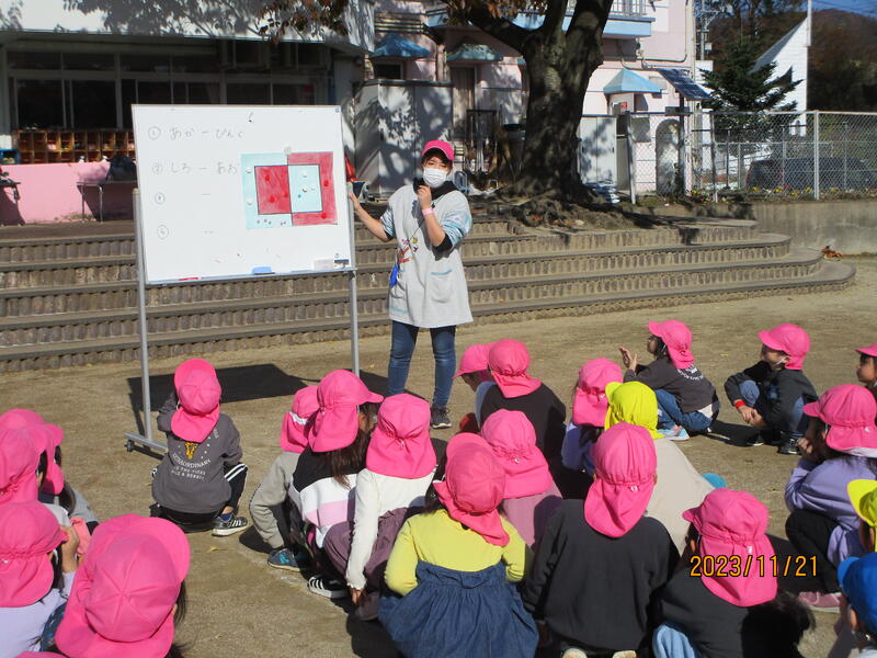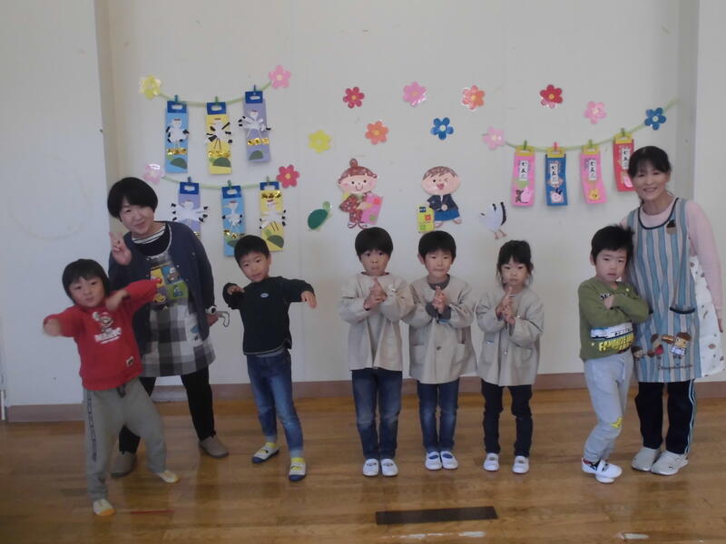 今日は「七五三の集い」を行いました。七五三にまつわる紙芝居を見た後に、各クラスの代表園児が千歳飴を入れる袋制作で頑張ったところを発表しました。七五三の歌をみんなで歌った後、みんなで記念撮影をしました。最後におやつをいただいて楽しい集いを終えました。千歳飴はおうちで楽しんでください。