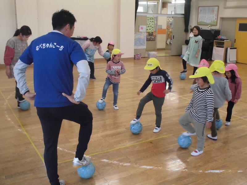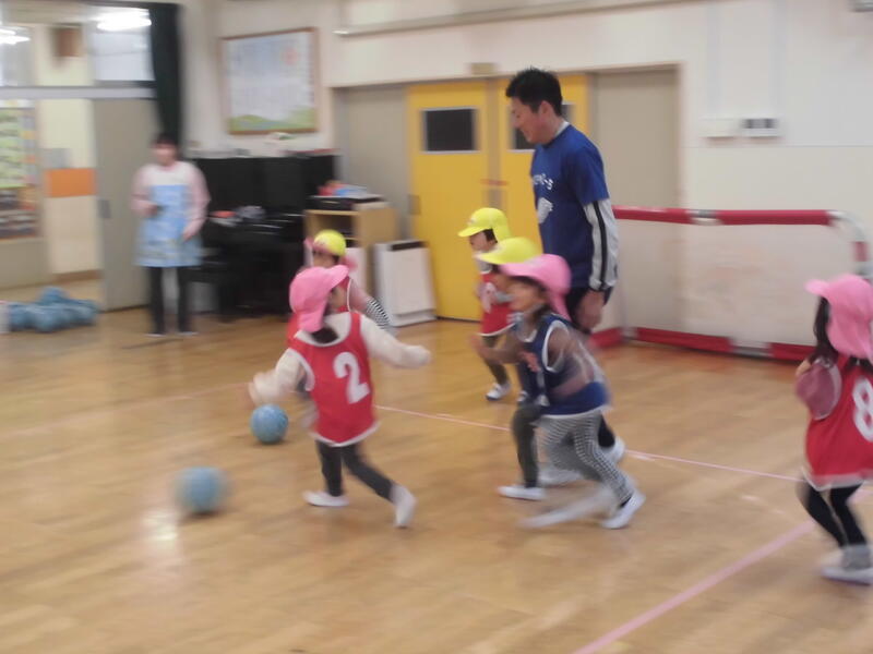 今日は今年度最後のサッカー教室でした。なべちゃんコーチの楽しいお話の後、ウォーミングアップで走ったり、「だるまさん物まね」をしたりしました。その後、ボールを使ったドリブルやチームに分かれてのゲームを楽しみました。