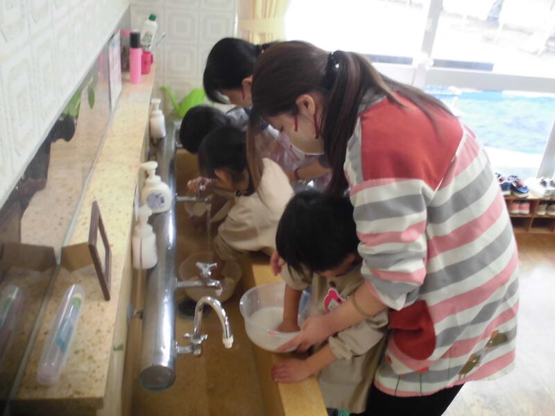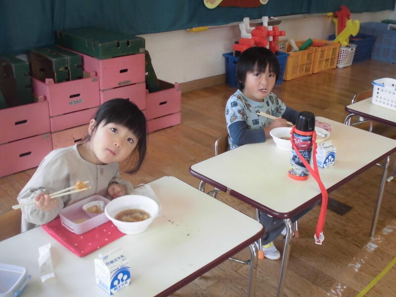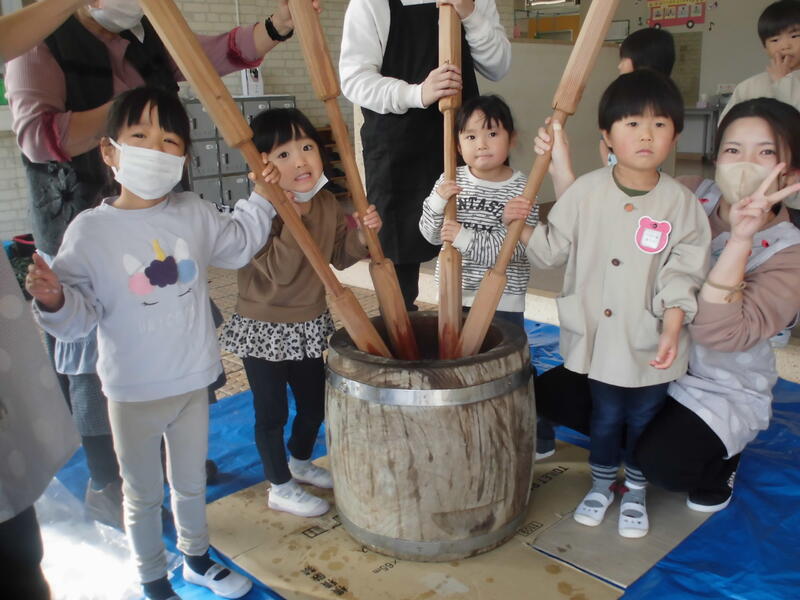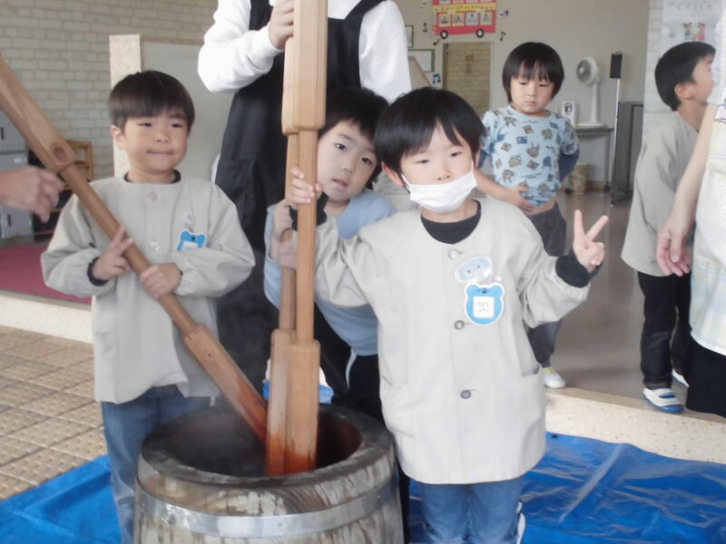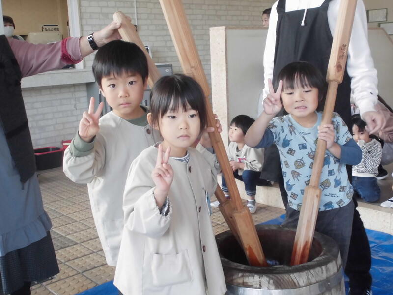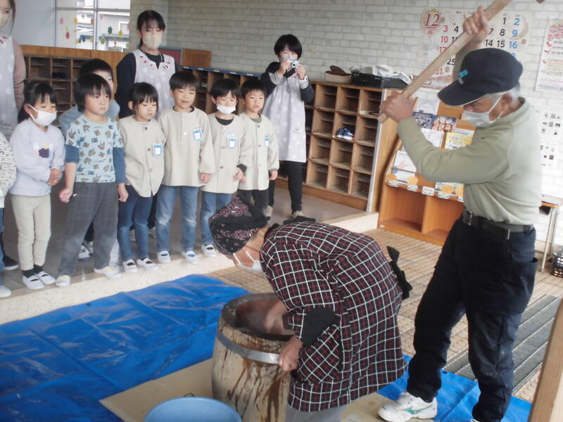 今日は「もちつき会」を行いました。前日に全員でもち米を研いで準備万端、おうちの方のお手伝いをいただいてもちつき開始。毎年お世話いただいている地域の方のもちつきを真剣に見つめて餅がつきあがるのを観察しました。また、自分たちも杵を使ってもちつきの体験を行いました。出来上がった餅をきな粉餅や雑煮にしておいしくいただきました。たくさんいただき皆満足そうでした。
