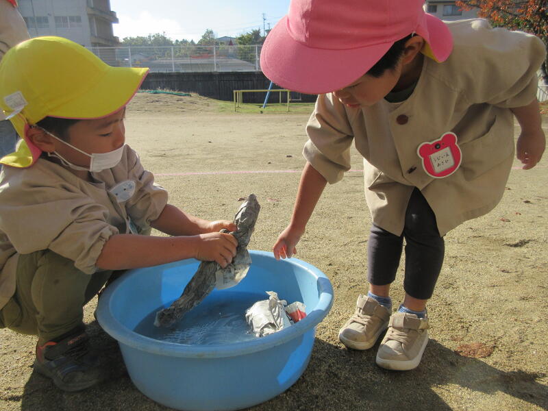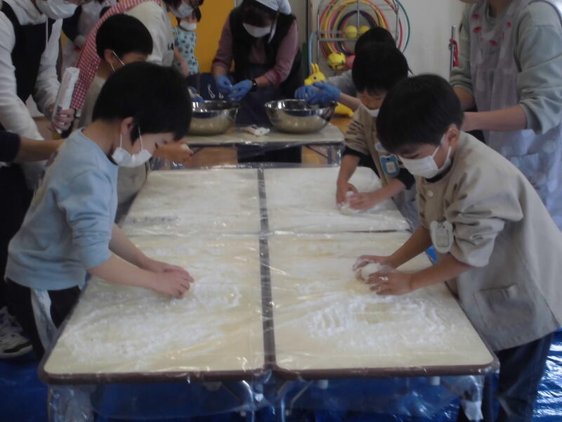 2023年12月1日 12時48分 今日は「もちつき会」を行いました。前日に全員でもち米を研いで準備万端、おうちの方のお手伝いをいただいてもちつき開始。毎年お世話いただいている地域の方のもちつきを真剣に見つめて餅がつきあがるのを観察しました。また、自分たちも杵を使ってもちつきの体験を行いました。出来上がった餅をきな粉餅や雑煮にしておいしくいただきました。たくさんいただき皆満足そうでした。
