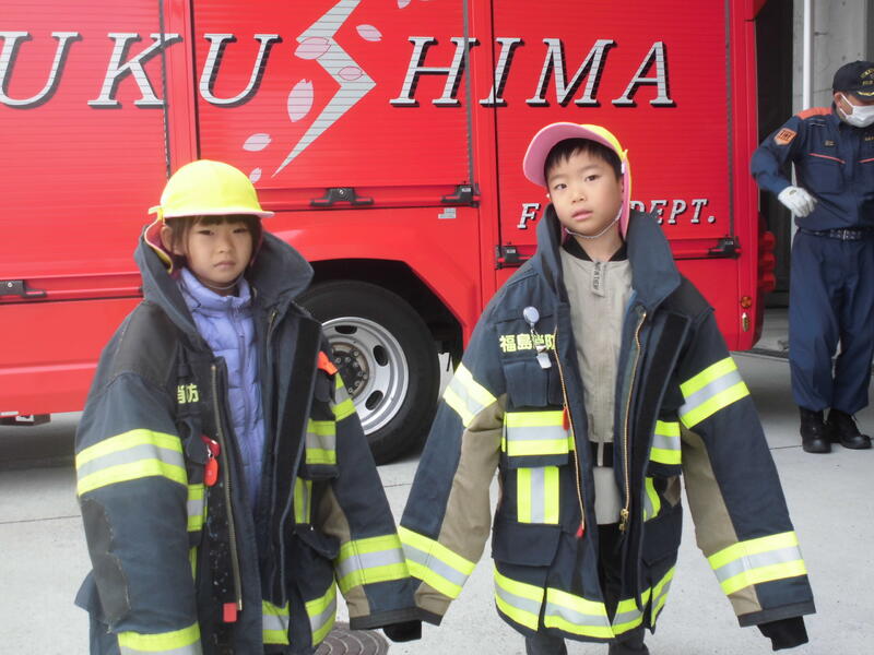 最初にDVDを見て、署員の皆さんの仕事の内容のについて知ることができました。また、消防車の装備を教えてもらい、一人ひとり防火服を着せてもらいました。最後に放水の様子を近くで見学しました。今回の見学を通して、消防士や救命士の方々が行っている仕事の大切さを学ぶことができました。