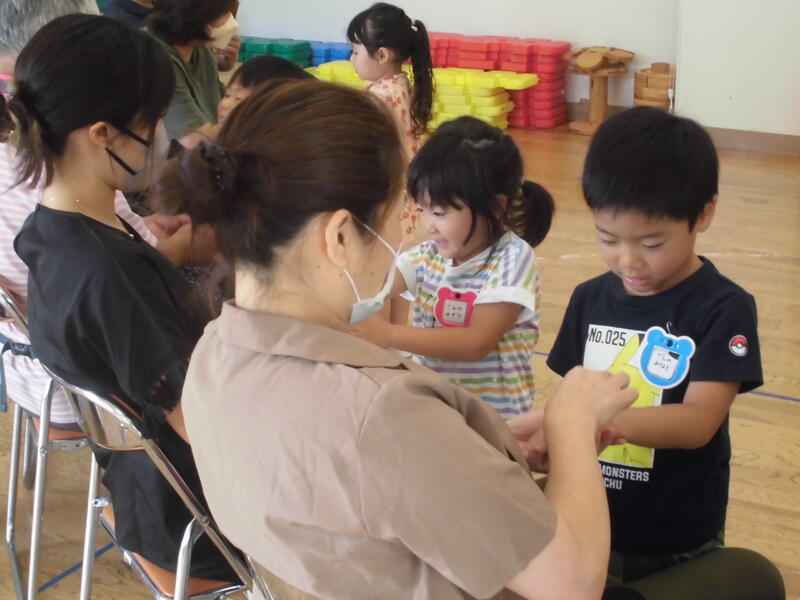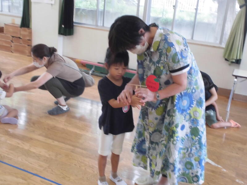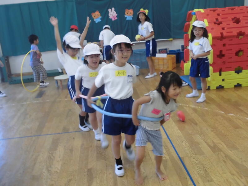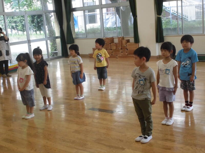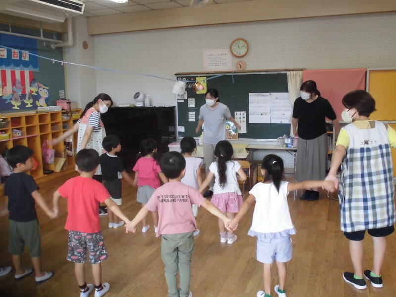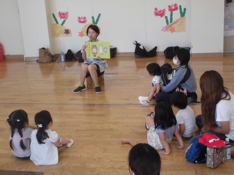 子どもたちは幼稚園児とともにいろいろな遊びを経験しました。お兄さん、お姉さんらしく、小さい子の面倒を見てくれました。その後、園児とともに「エビカニクス」を楽しく踊りました。最後に紙芝居を真剣な表情で鑑賞していました。次回の未就園児保育は9月30日(土)の運動会になります。たくさんの子どもたちの参加を期待しています。