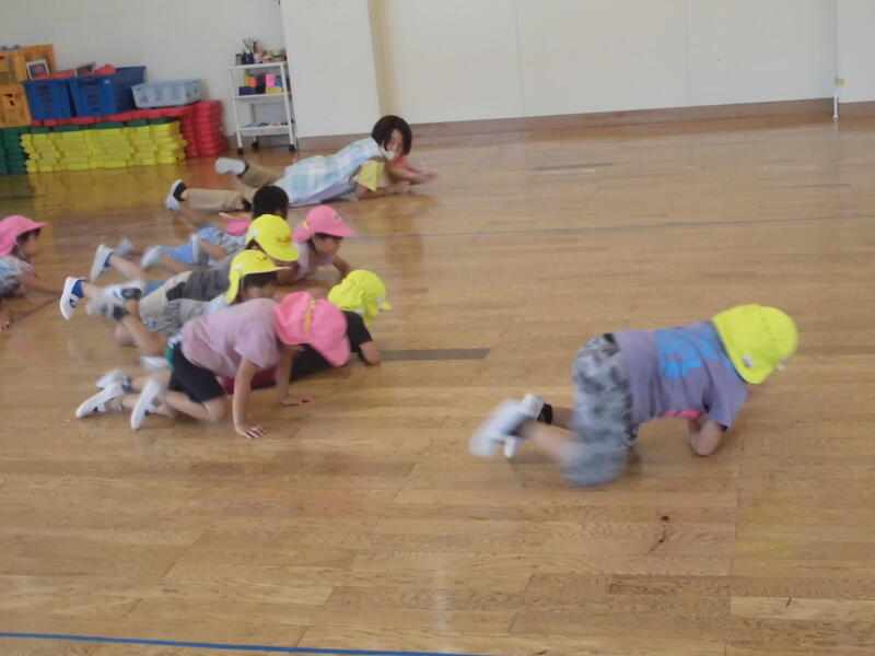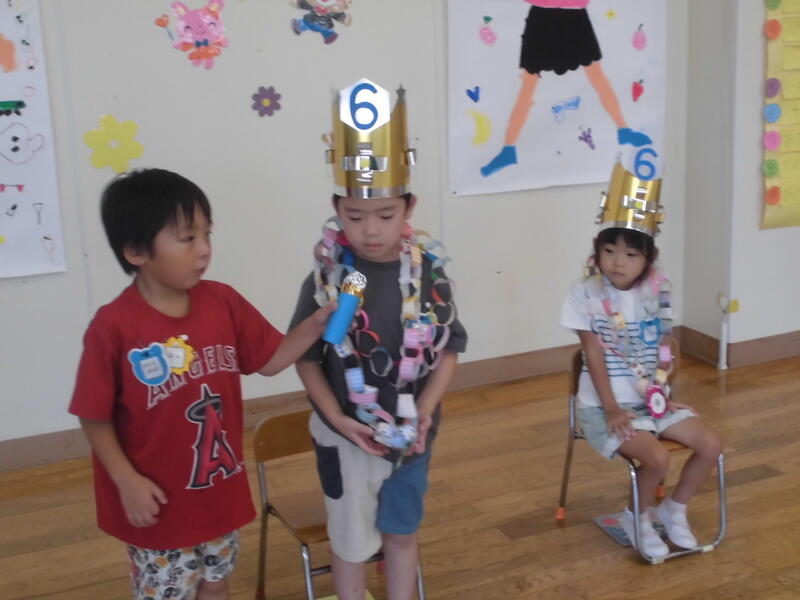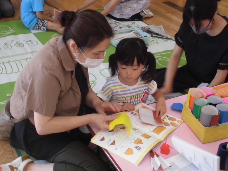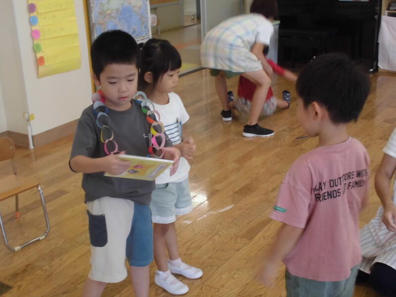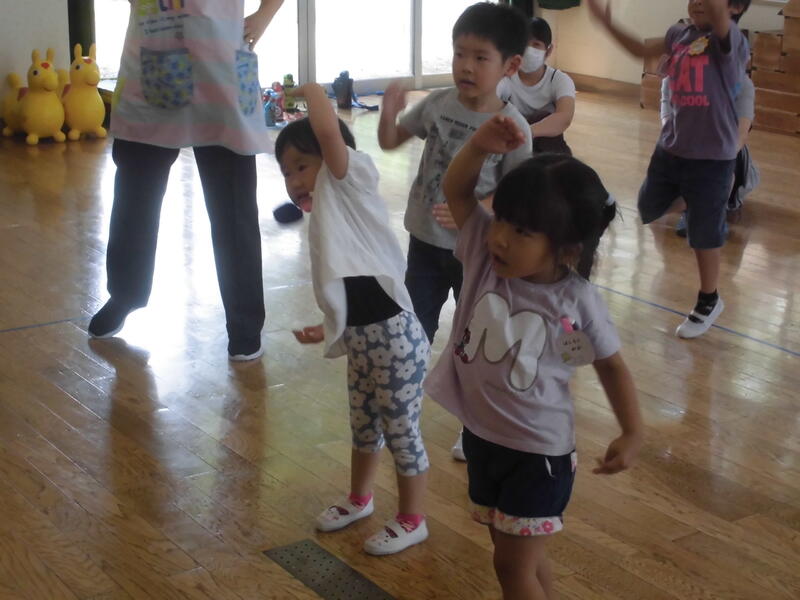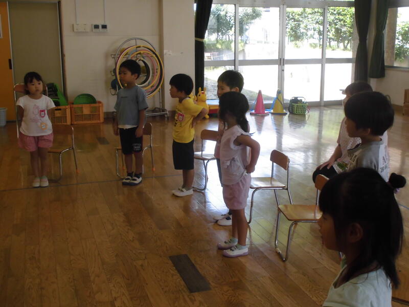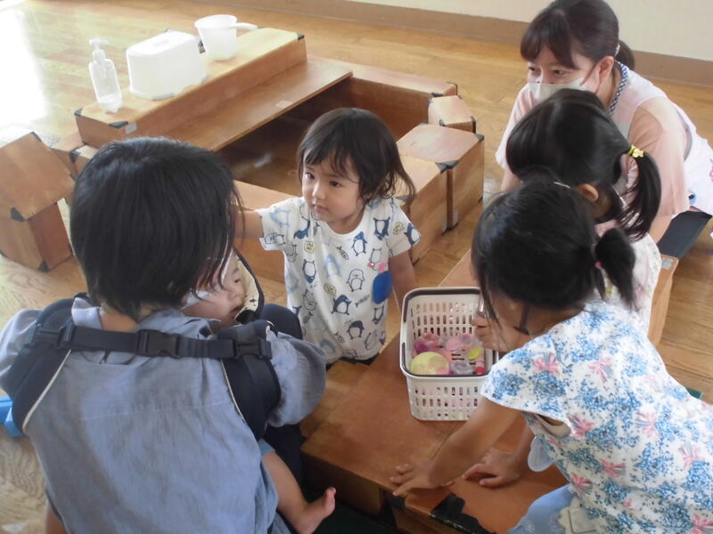 子どもたちは幼稚園児とともにいろいろな遊びを経験しました。お兄さん、お姉さんらしく、小さい子の面倒を見てくれました。その後、園児とともに「エビカニクス」を楽しく踊りました。最後に紙芝居を真剣な表情で鑑賞していました。次回の未就園児保育は9月30日(土)の運動会になります。たくさんの子どもたちの参加を期待しています。
