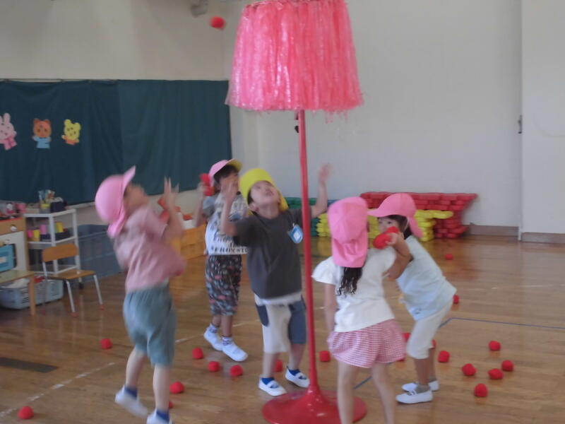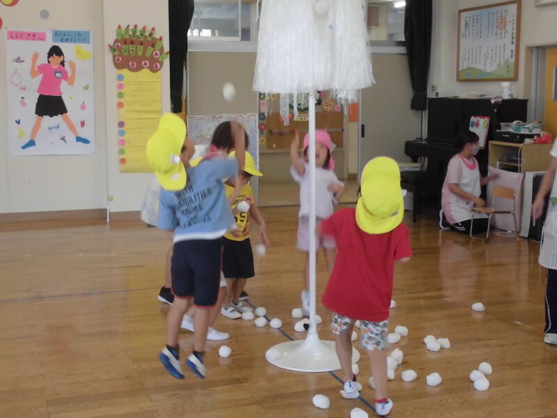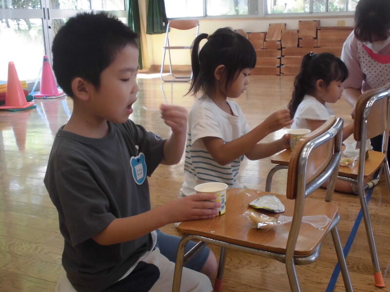 そしてお楽しみは、2チームに分かれての玉入れ。初めて挑戦したうさぎ組のみんなも籠めがけて元気に球を投げ入れました。最後におやつタイム。おいしいヨーグルトを堪能していました。