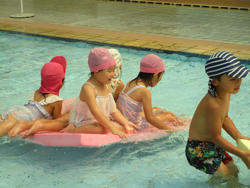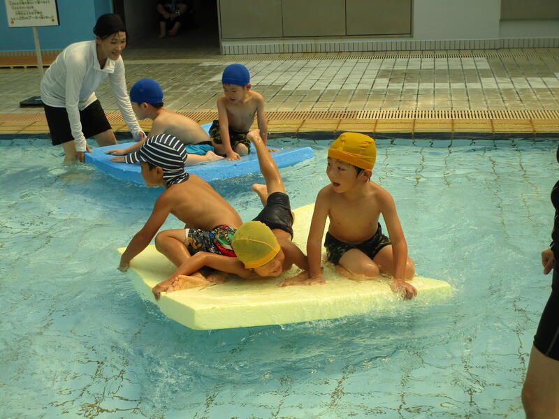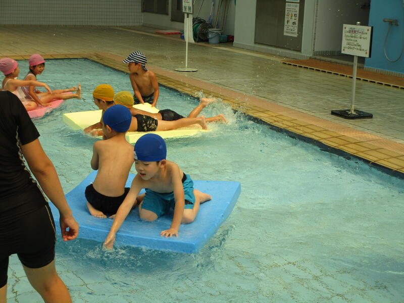プールサイドで入念に準備運動を行い、プールに入ります。いろいろな姿勢でプールの中を移動していきます。その時水に顔を付けたり、潜ったりするお友達もいました。また、ボードに乗ってプールの中を移動して楽しく遊びました。