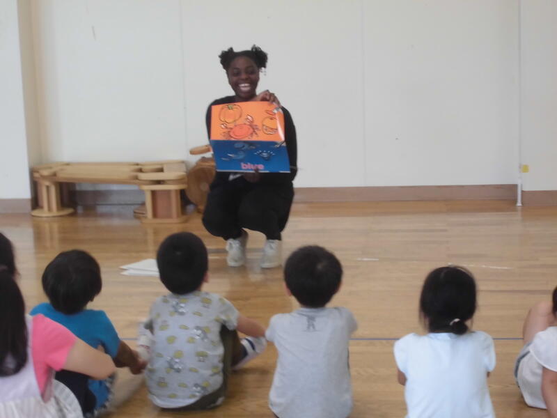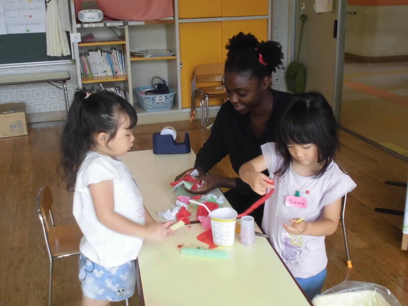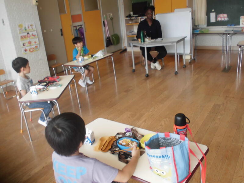 また、今回はベネ先生が描いた絵を使って様々な色を英語言うことができました。子どもたちと製作活動を一緒にしたり、昼食をともにしたりと楽しい時間を過ごしました。