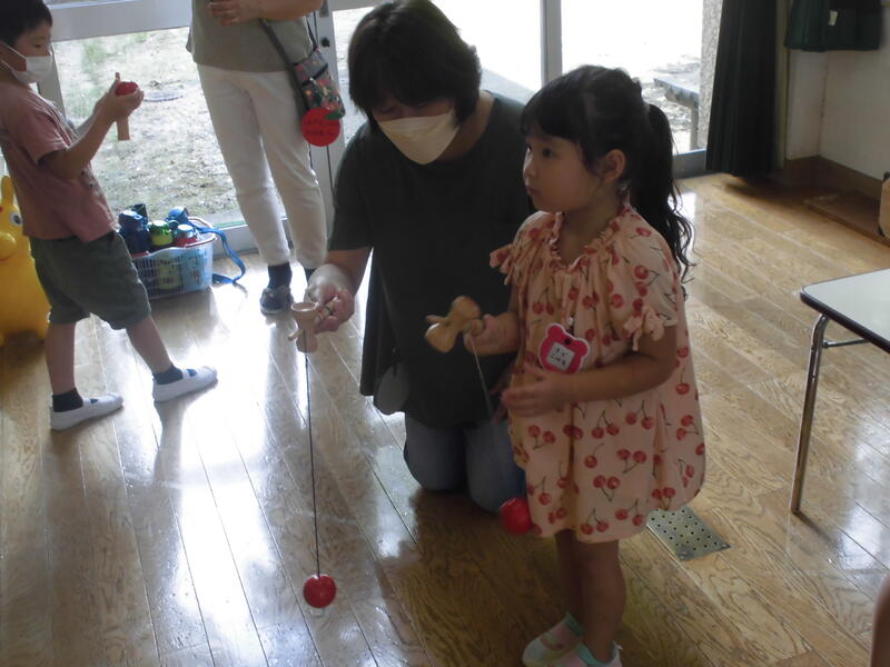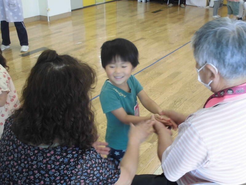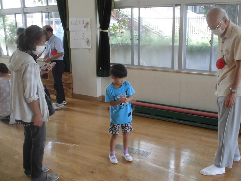 今日は「祖父母参観」を開催しました。ダンスや歌を披露をした後、おじいちゃん・おばあちゃんと手遊びをしました。また、ともに楽しめる様々な遊び(けん玉、コマ回し、竹とんぼ、折り紙、お手玉、おはじき等)に挑戦しました。おやつをいただいた後、手作りのプレゼントを手渡しました。