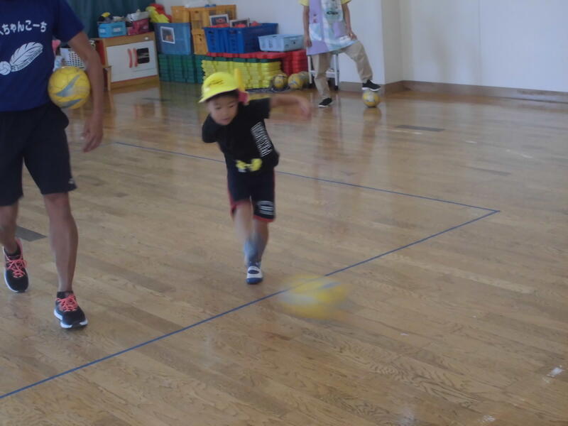 今日は待ちに待ったサッカー教室がありました。子どもたちは口々に「なべちゃんコーチ早く来ないかなー」と言っていたところでコーチが登場。楽しい雰囲気でサッカー教室が始まりました。