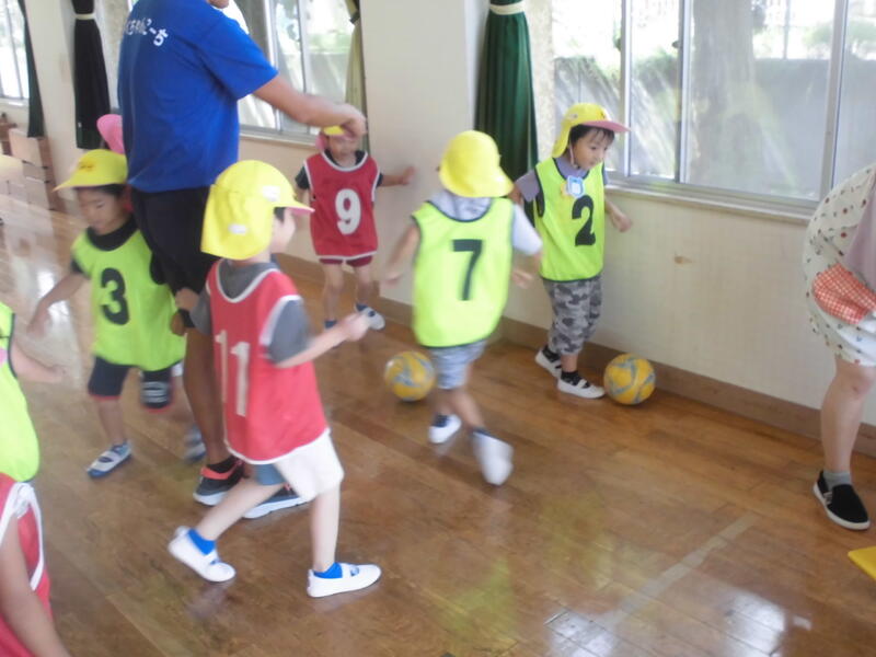 動物になって移動したり、鬼ごっこをしたりとウォーミングアップをした後、ドリブルを入れてのシュートを行いました。最後に、チームに分かれてゲームを行いました。時が過ぎるのがとても速く感じられるほど楽しいサッカー教室でした。