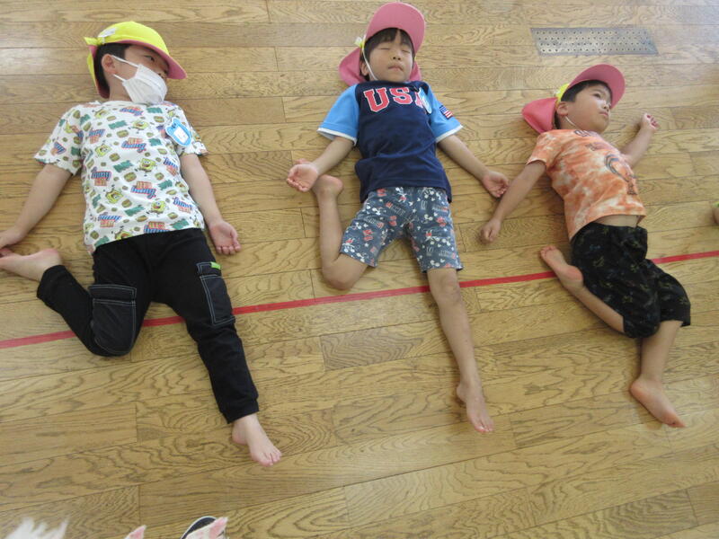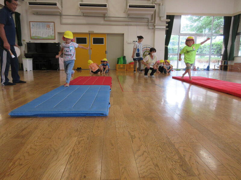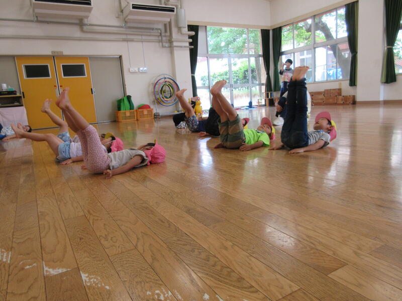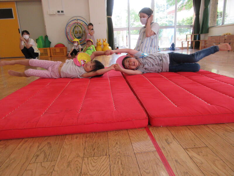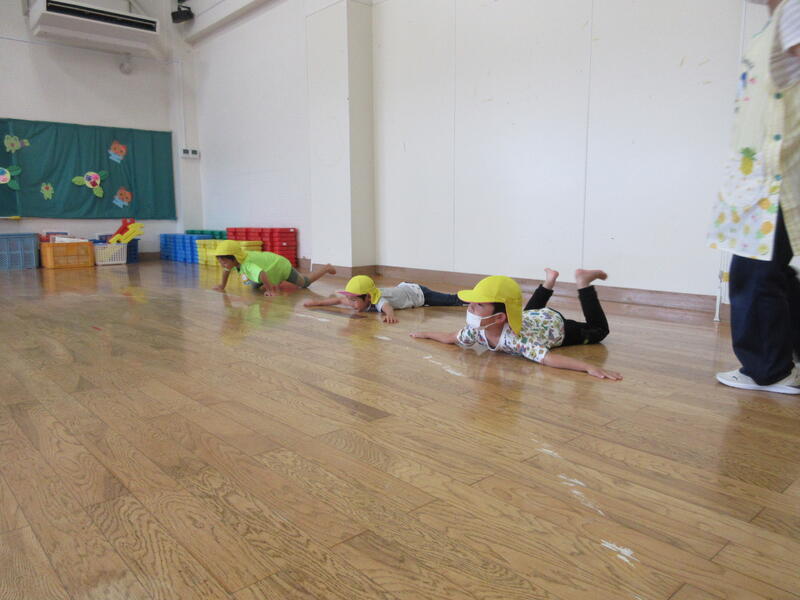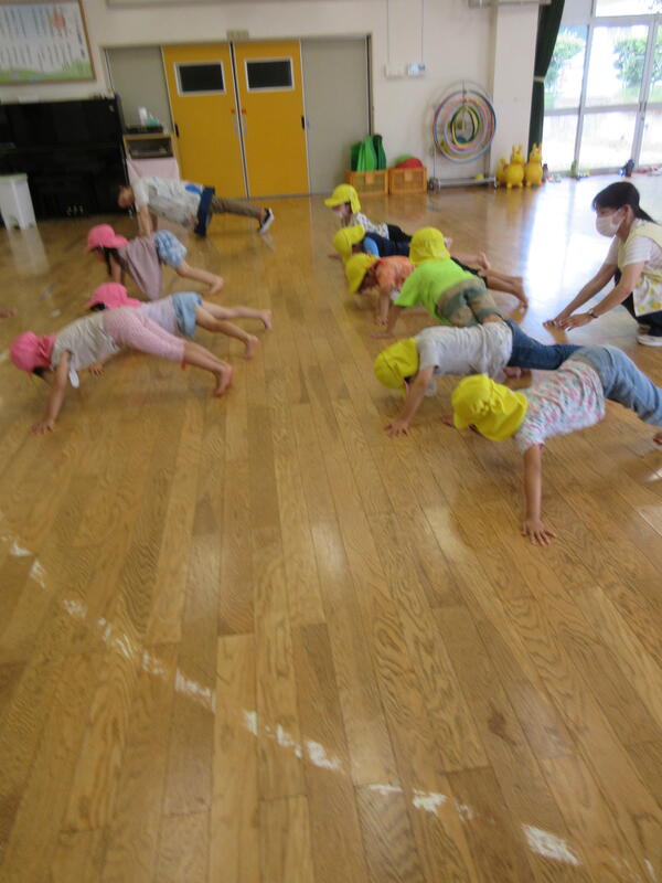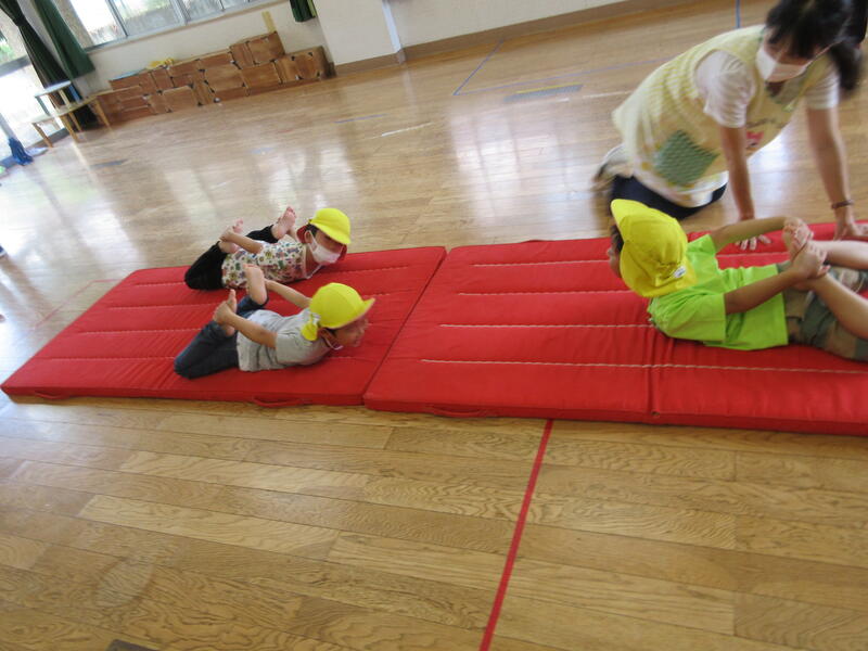 毎月1度、園長先生と運動遊びをする時間があります。今日は、いろいろな姿勢から走る動きと、マットを使った運動を行いました。皆汗だくになりながらも、真剣に取り組んでいました。