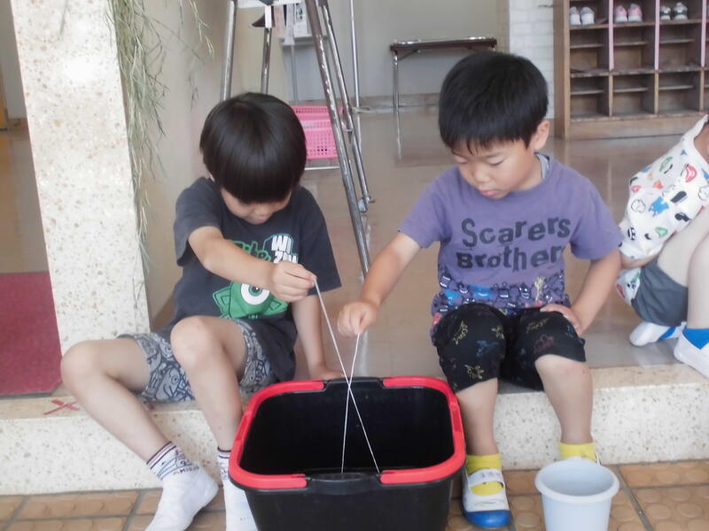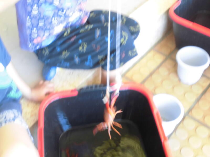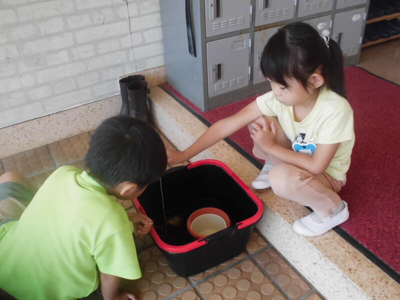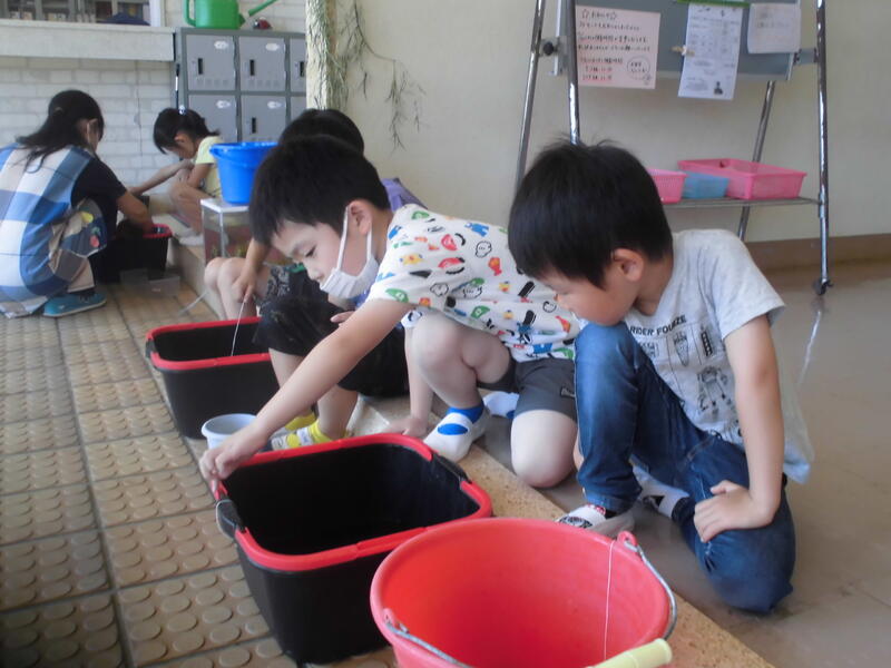 幼稚園に新たな生き物が加わりました。「ザリガニ」です。ザリガニを釣ろうと、スルメをエサにして水槽に糸を垂らしました。ザリガニのはさみのあたりにエサを垂らし、ザリガニを刺激しないように声を潜めて待つこと数分、見事釣り上げることができました。その後も何人もの園児が釣り上げました。