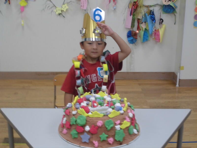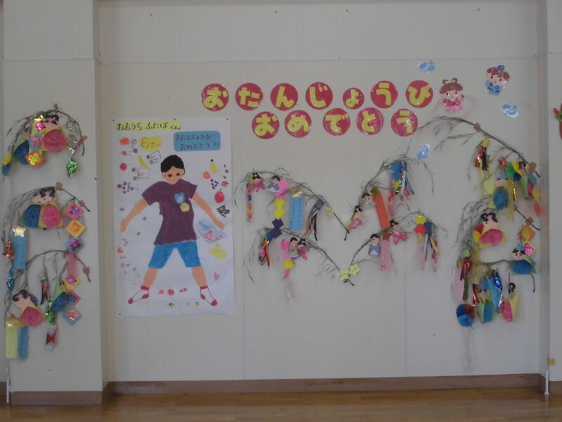 壁に誕生日のお友達の等身大の絵や、願い事や飾りをつけた笹の葉を掲げました。お誕生会では7月の誕生日を迎えるお友達にプレゼントを渡し、ケーキの火を消して「お誕生日の歌」を全員で歌いました。