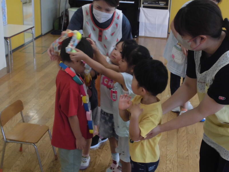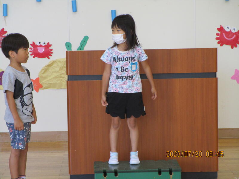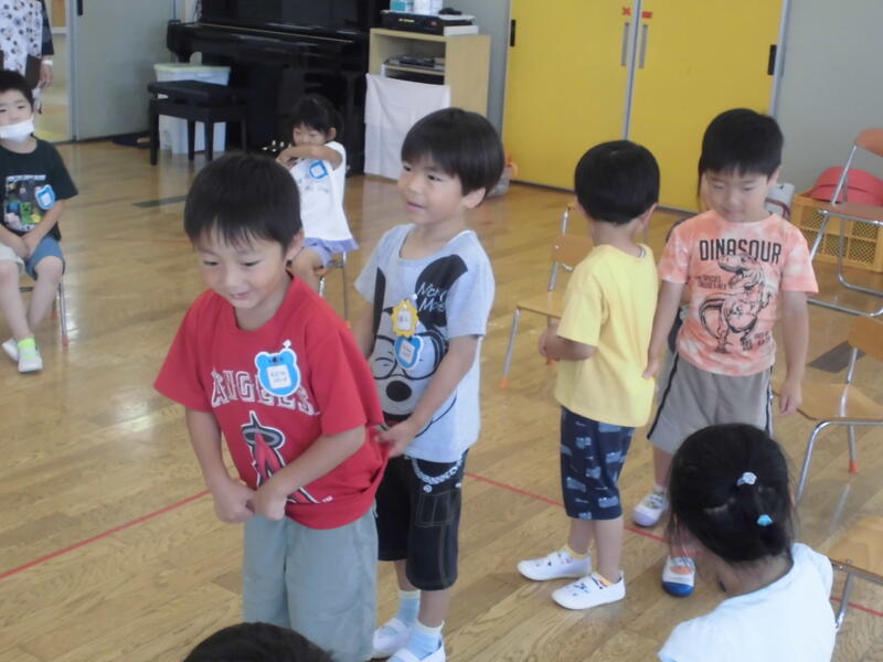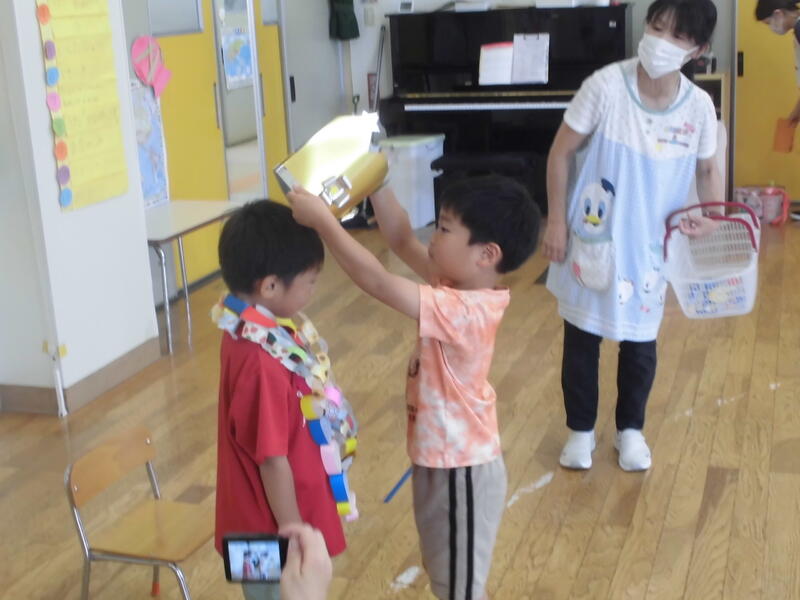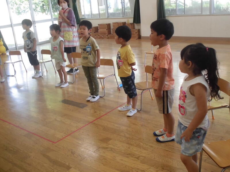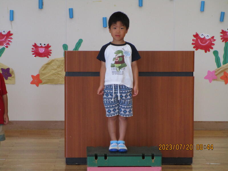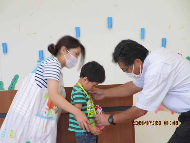 その後一人ひとりが1学期頑張ったことを発表し、園長先生から「頑張りメダル」をもらいました。夏休み中も規則正しい生活を心掛け、8月22日には元気な顔を見せてください。