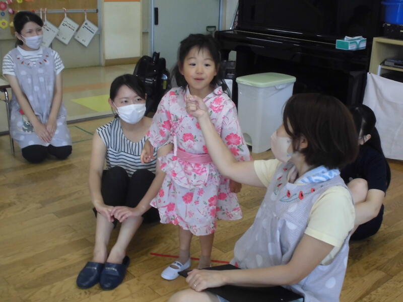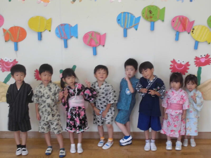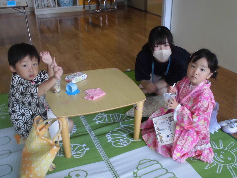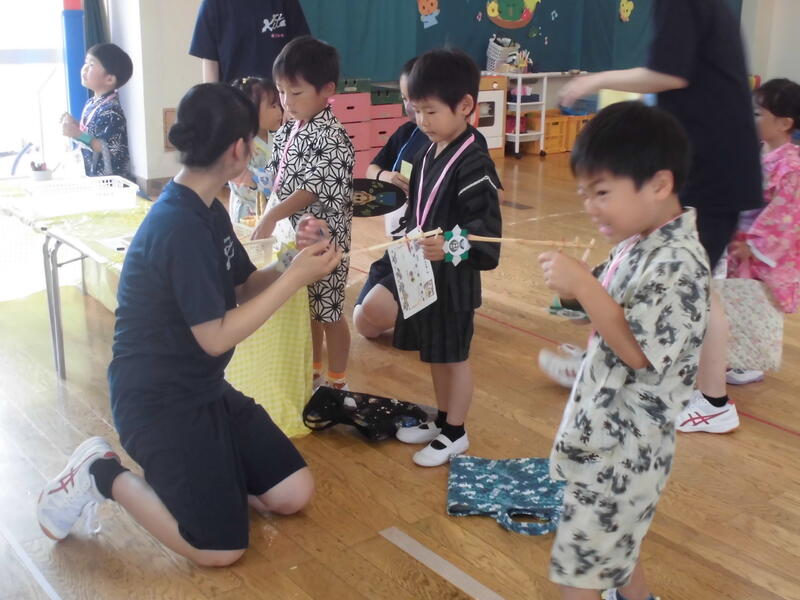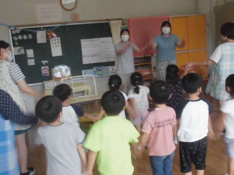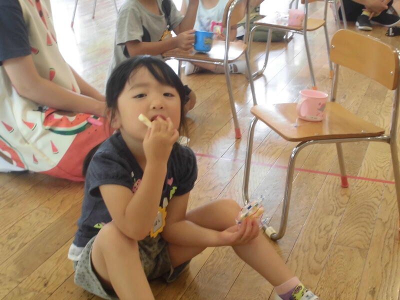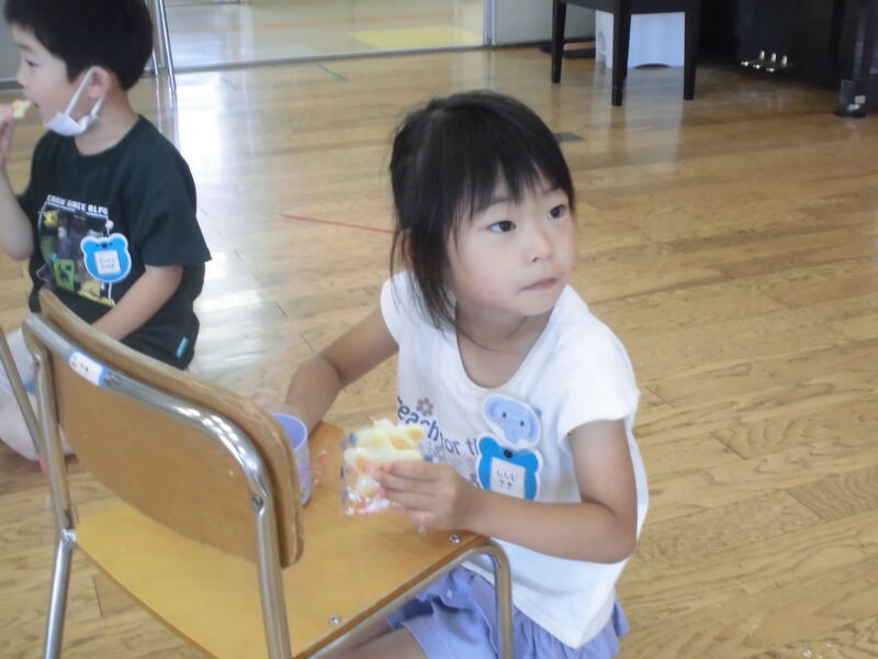 七夕を祝って、みんなで「たなばたさま」を歌い、代表の園児が願い事を披露しました。そして、お楽しみのゲームをした後、おいしくおやつをいただきました。願い事がかなうとよいですね。
