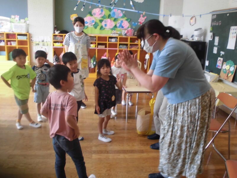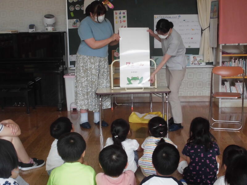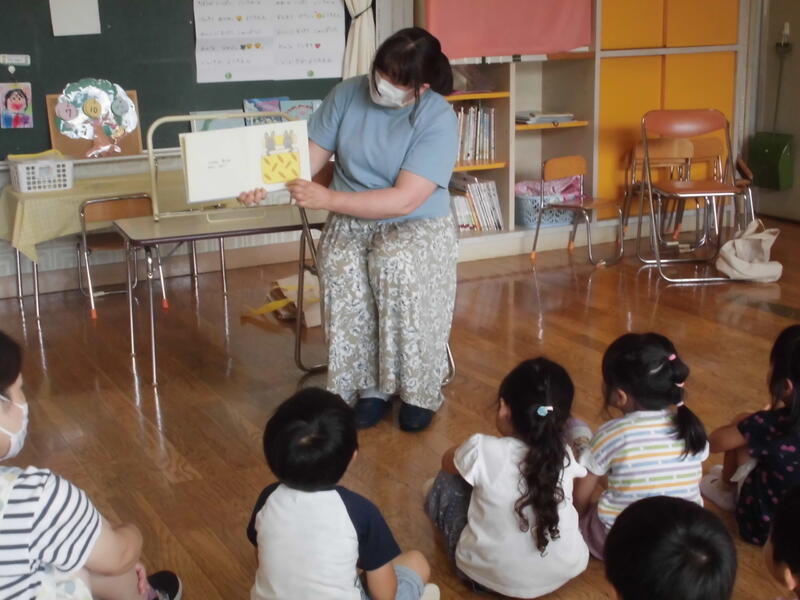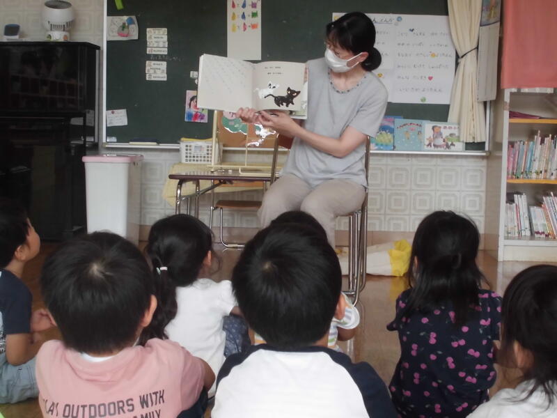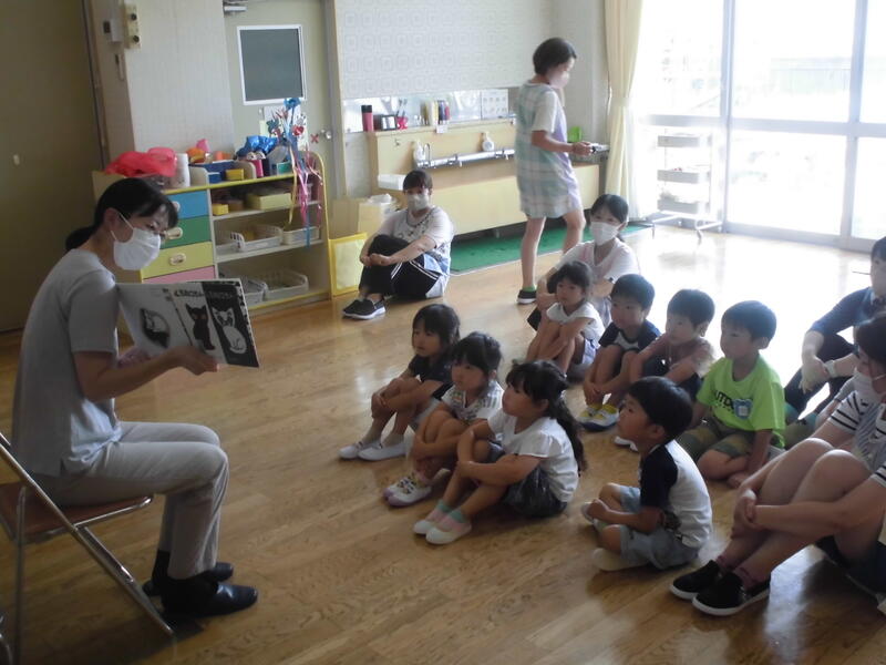 興味深い内容の本を、2名の先生が楽しく読んで聞かせてくれました。最後に手遊び歌をみんなで歌って終了。子どもたちは名残惜しい思いをもちながらも、先生とタッチをしてお別れしました。次回の読み聞かせ会が楽しみです。