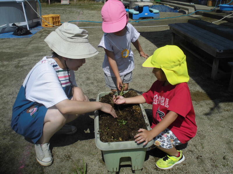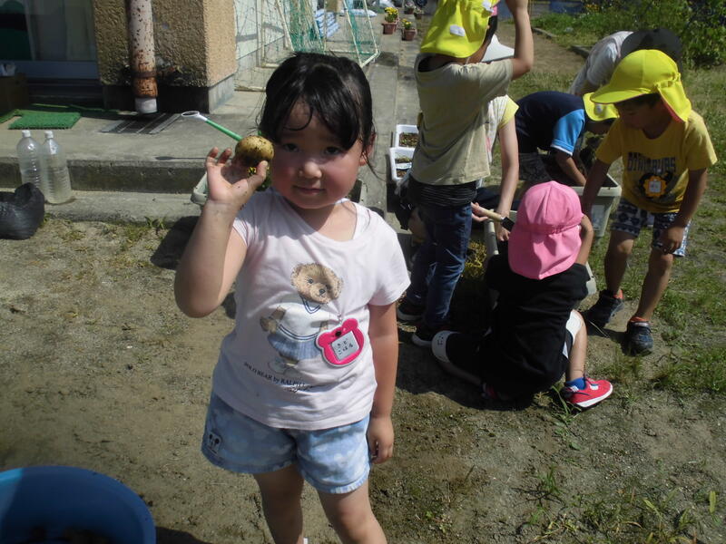 今日は、金曜日に行われる「カレー会食」の食材となるジャガイモを収穫しました。プランターに植えたジャガイモはやや小ぶりではありましたが、たくさん見つけることができました。金曜日が楽しみです。