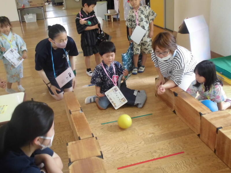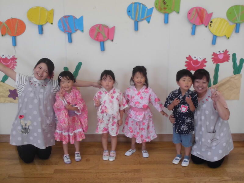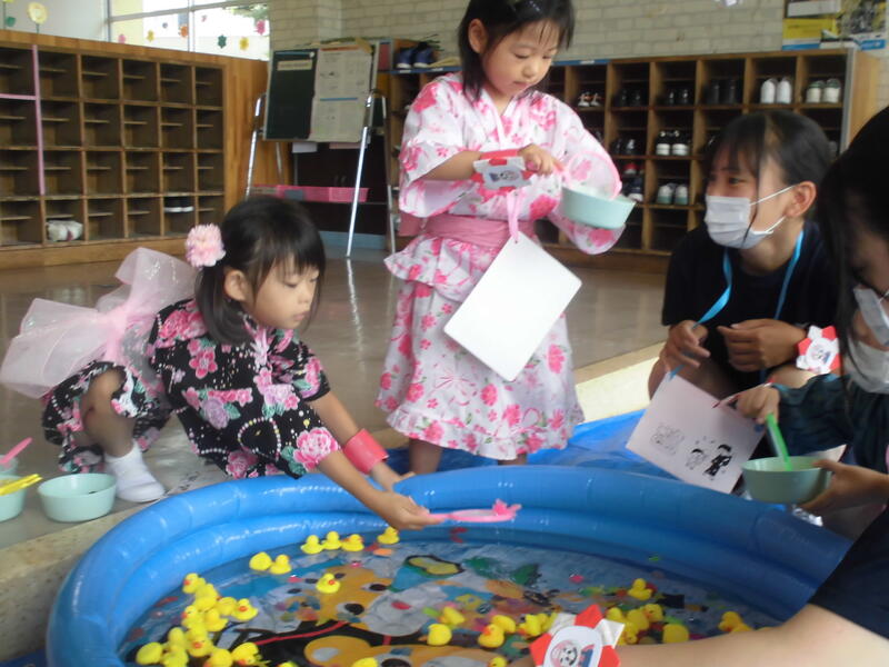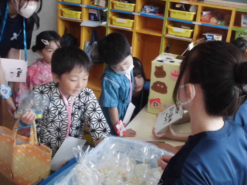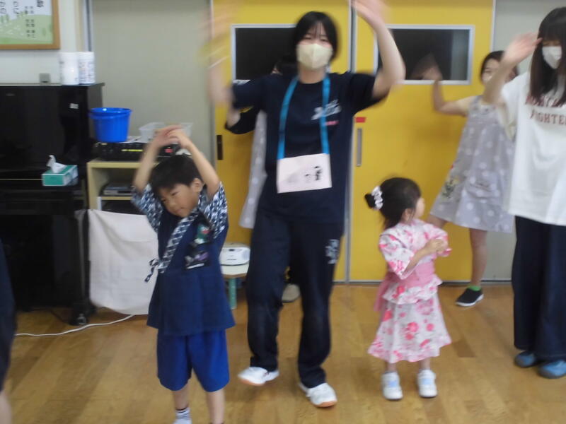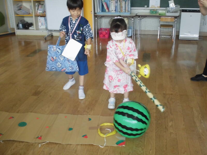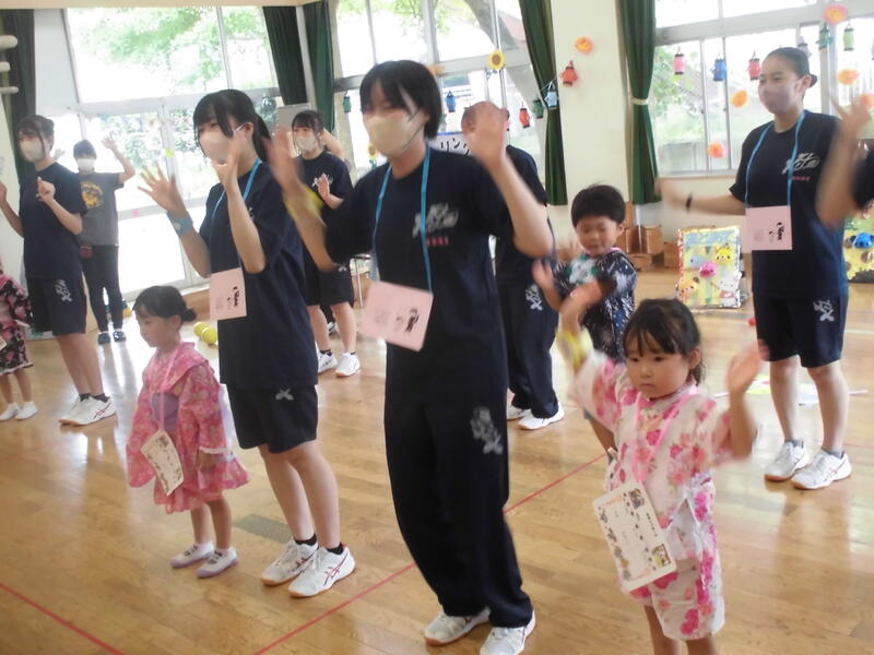 今日は待ちに待った「夏まつり」でした。朝早くから保護者の皆さんと福島北高校の生徒が準備を進め、いよいよスタート。最初に高校生がリズムダンスを紹介して、園児と一緒に踊りました。その後、高校生と一緒にアトラクション(ボウリング、的当て、金魚すくい、クイズ、スイカ割)を回りました。最後に全員で盆踊りを元気よく踊り、閉会式では、今日のお祭りの感想を発表しました。