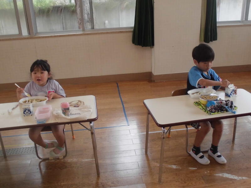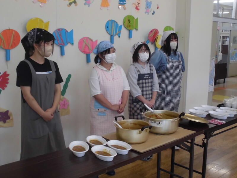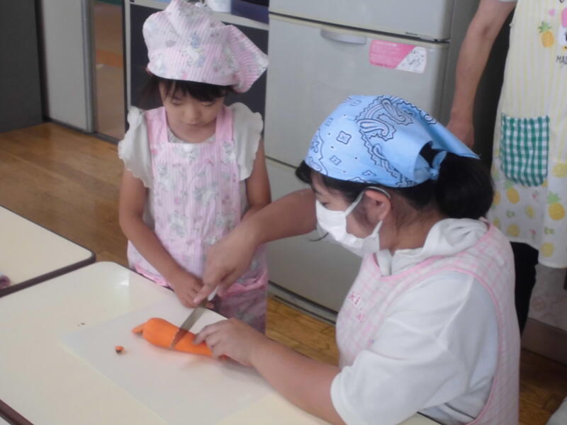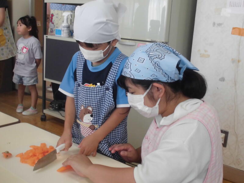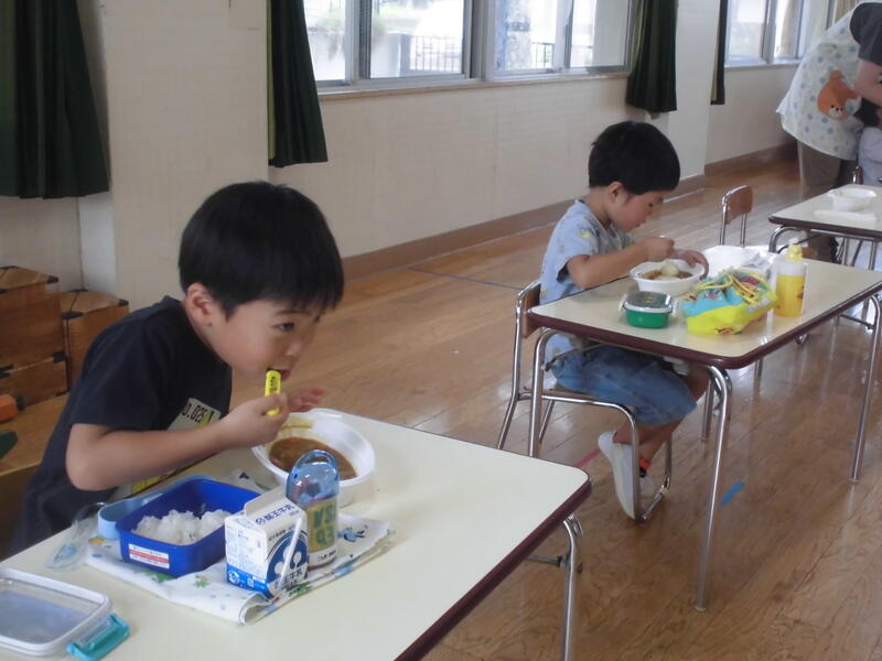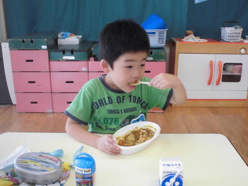 年少さんは玉ねぎの皮むき、年長さんはおうちの方と一緒にニンジンや玉ねぎを慎重に切りました。出来上がりを心待ちにしていた園児の皆さんは、「いただきます」の後、持ってきたご飯とともにカレーを味わいました。次々とおかわりをしておなかもいっぱいに。デザートにチョコバナナもいただきました。
