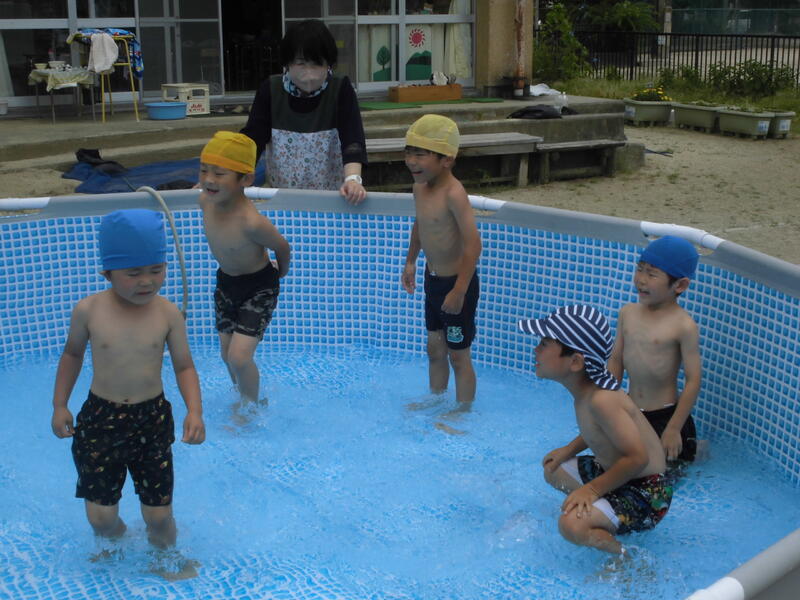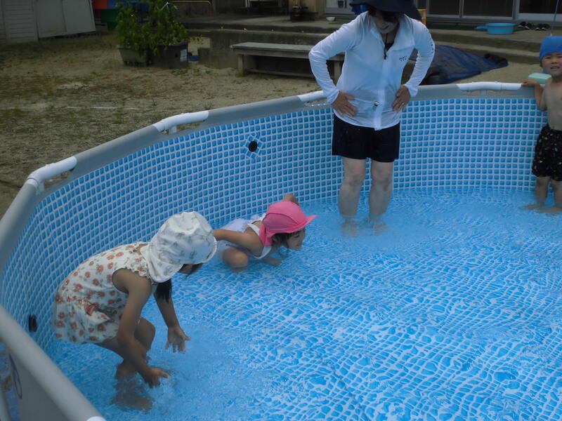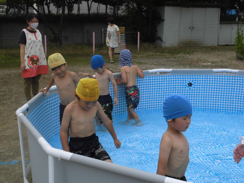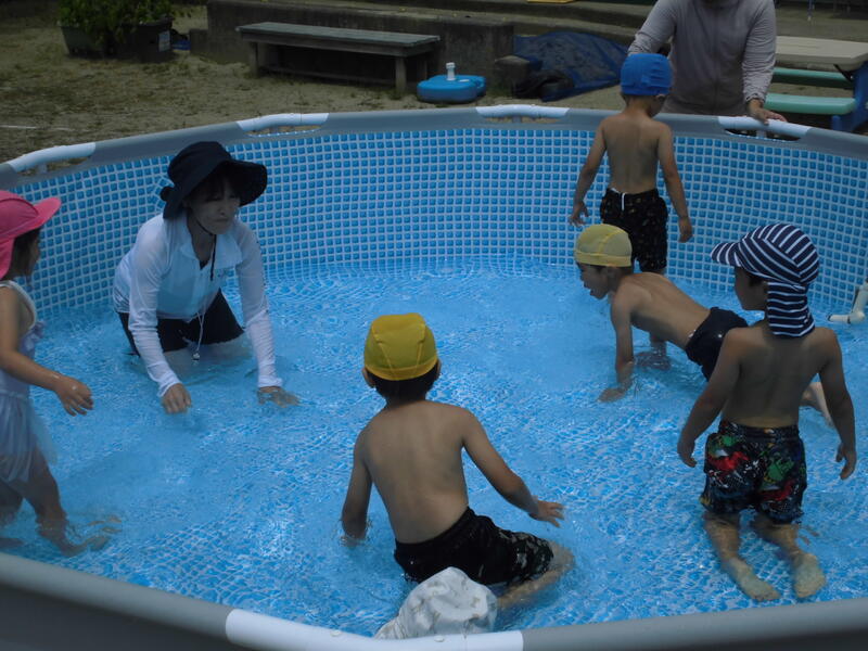 今日は1学期最後のプール遊びをしました。準備運動をしっかり行い、いざプールの中へ。膝やおなか、顔に水をかけて水に慣れます。アザラシやエイになって水の中を進みました。