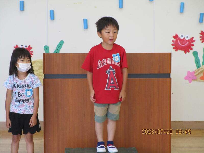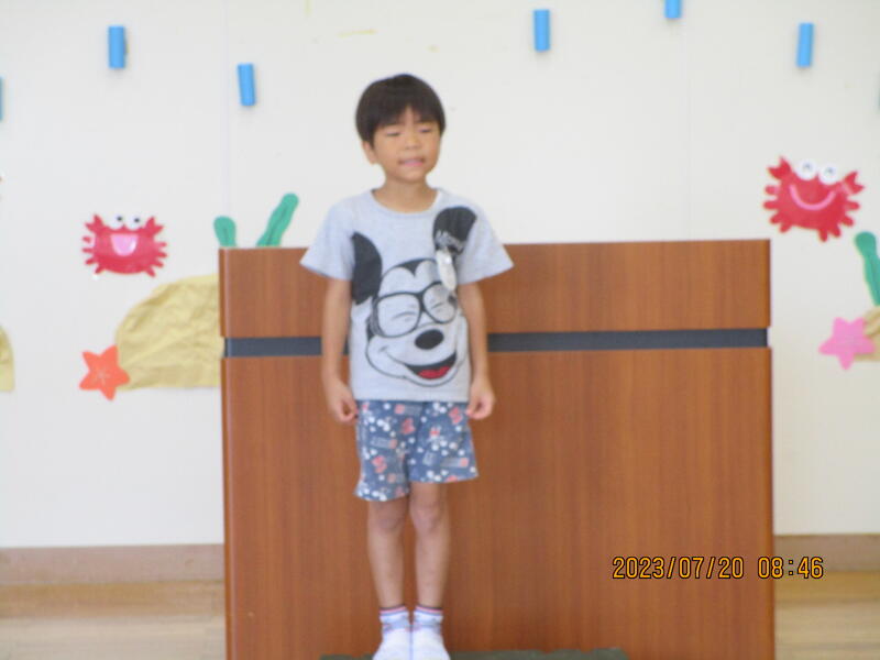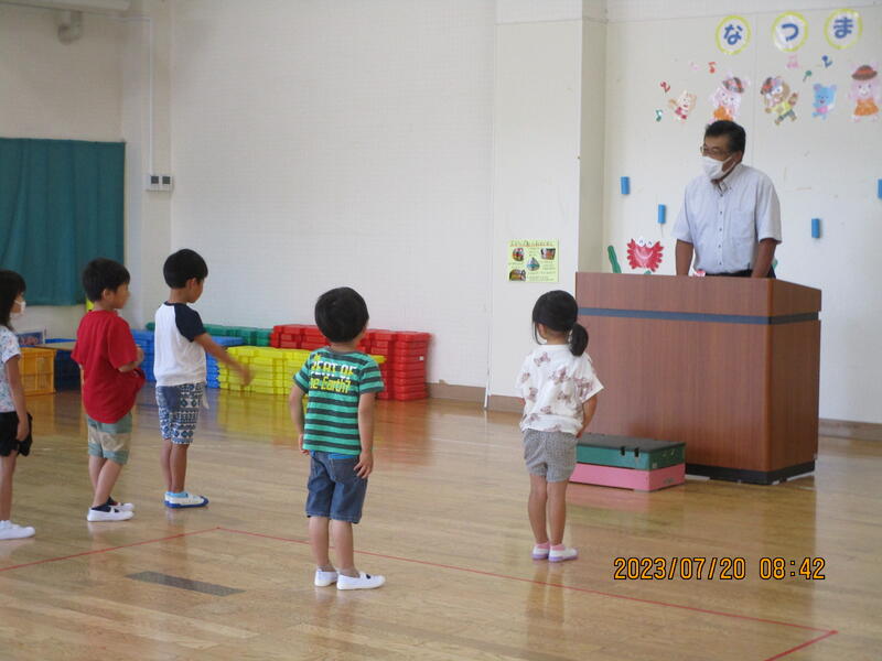 2023年7月20日 09時46分今日は第1学期終業式が行われました。園歌を元気に歌った後、園長先生のお話がありました。1学期頑張ったことや、夏休みを楽しく安全に過ごそうという内容でした。