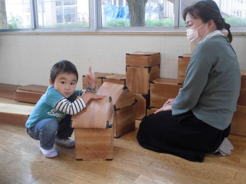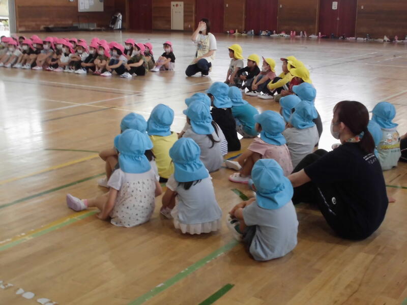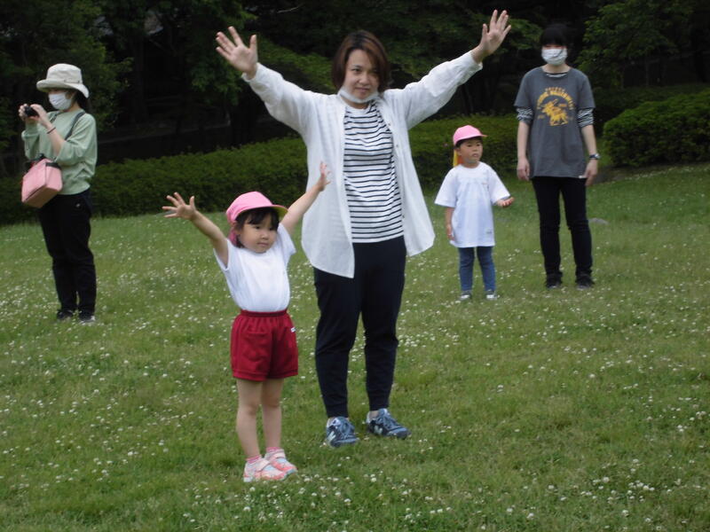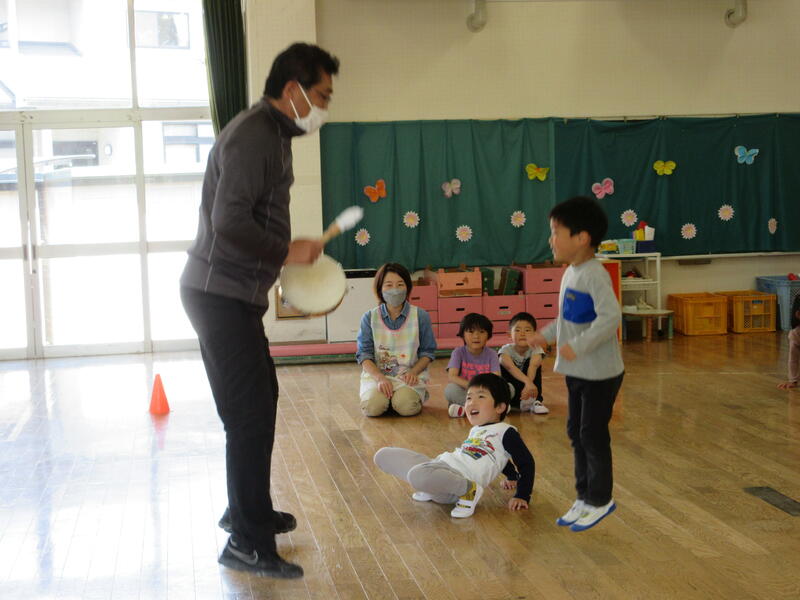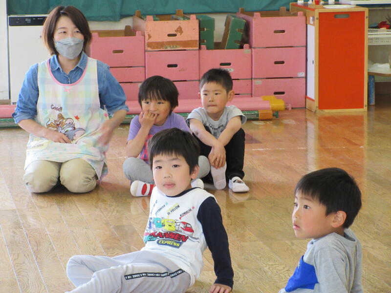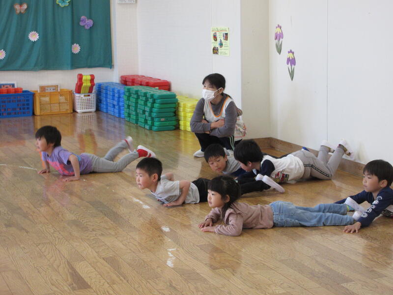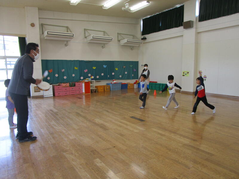 大きく体を動かして歩いたり、いろいろな姿勢から立ち上がって走ったりした後、「ジャンプじゃんけん」で園長先生と真剣勝負をしました。第2回目が楽しみです。